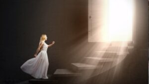バーチャル背景の中央には、女性が扉から差し込む光に向かっていく絵がありました。